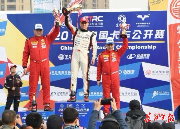 中国卡车公开赛武汉体育中心拉开战幕,第一回合决赛颁奖仪式(冠军龚斌、亚军孟庆波、季军张一哲)记者高勇 摄