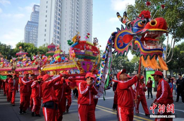 12月14日,传统民俗活动蜈蚣阁亮相厦门海沧钟山送王船文化节。当日,三年一届的厦门海沧钟山送王船文化节在海沧钟山水美宫开幕。 中新社记者 张斌 摄