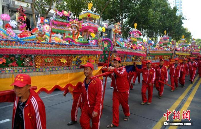 图为当地民众扛着王船游境。 中新社记者 张斌 摄