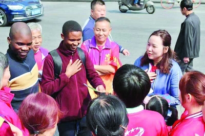 军运会期间,“吉庆大妈”在街头与外国友人热情交流 通讯员刘培 摄