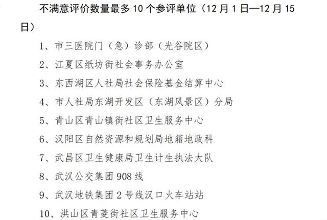 楚天都市报12月15日讯(记者王荣海通讯员武治庸)今日,武汉市治庸办通报12月份前半月“双评议”情况。各区、市直部门、公共服务企业、市区医院、旅游景区综合排名前三和后三名单出炉。同时还公布了10个不满意评价数量最多的单位。