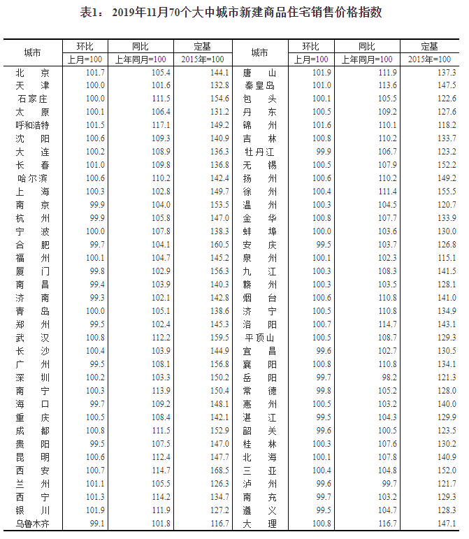 国家统计局12月16日发布消息,国家统计局今日发布了2019年11月份70个大中城市商品住宅销售价格变动情况统计数据。对此,国家统计局城市司首席统计师孔鹏表示,11月份商品住宅销售价格走势总体平稳。