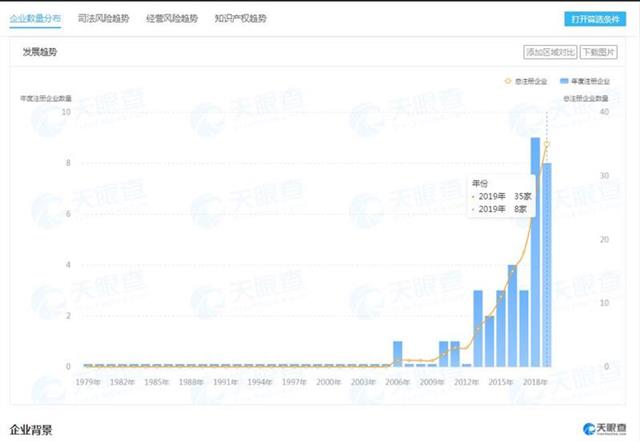 天眼查数据显示,截止2019年,武汉市经营范围内含有“智能门禁”的企业共有35家,今年全年新增8家。