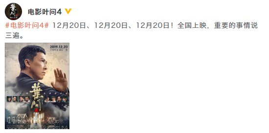网易娱乐12月17日报道 12月17日上午,“叶问”系列完结篇《叶问4》通过官方微博宣布档期不变,仍在12月20日上映。