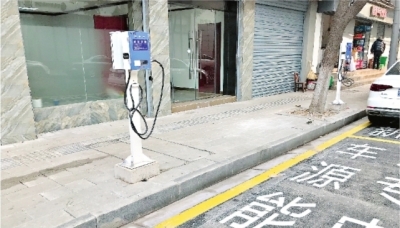 江岸区二曜路上,新能源车充电专用车位旁,蓝色充电桩忽然竖立起来。充电桩界面上写有操作方法和工作状态指示灯。新建的充电桩和新能源车专用充电停车位,等待着为新能源车辆供给电能。