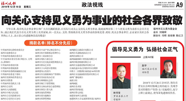 2019年12月18日,《福州晚报》刊发两版文章介绍福州市第二十六次见义勇为表彰大会先进分子(群体)事迹,其中因救下被侵犯的女子引发社会关注的赵宇名列其中。记者从赵宇处获悉,12月18日上午,福州市见义勇为基金会将召开表彰大会,为他和其他见义勇为先进分子颁奖。