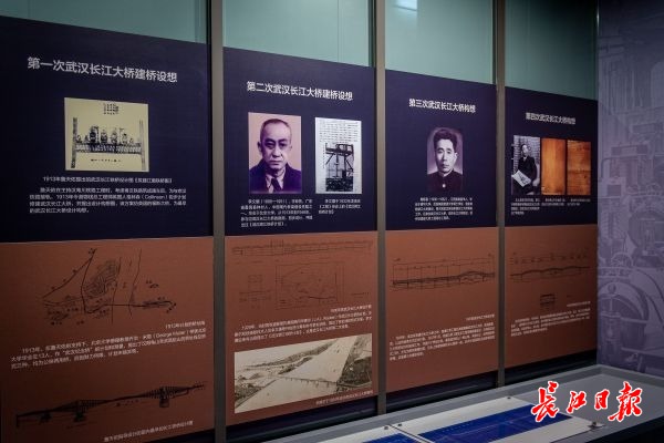 从现场文献中看到,武汉长江大桥的建设构想始于民国时期,1912年孙中山先生提出建桥设想。詹天佑、李文骥、梅旸春、茅以升等曾提出四个版本的建桥构想,有的还进行过初步的勘测设计工作,馆内展示了当年各个设计图纸。