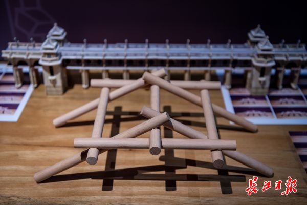 现场工作人员演示,用9根小圆木棍就搭成一座桥,没有一丁一卯,仅靠凹槽和卡扣连接,记者从上方按压了一下,相当牢固。据说这就是最简单的“虹桥”结构。