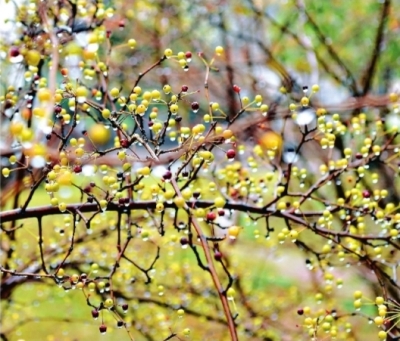 雪水打落了无数黄叶,也挂在了小果子和叶尖上,聚成一颗颗晶莹剔透的水珠,久久不愿离去