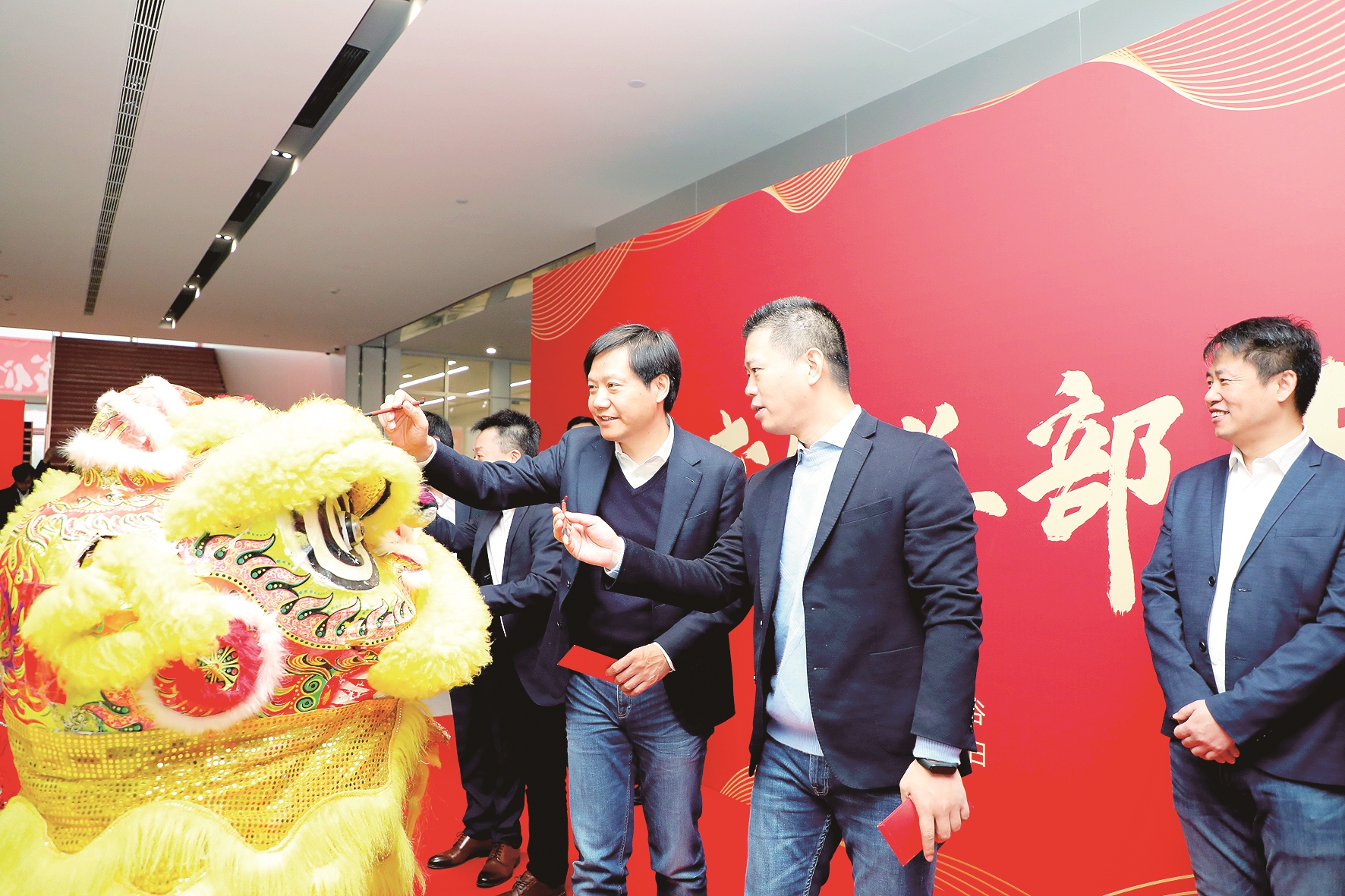小米集团董事长雷军(右三)为武汉总部开园“点睛”