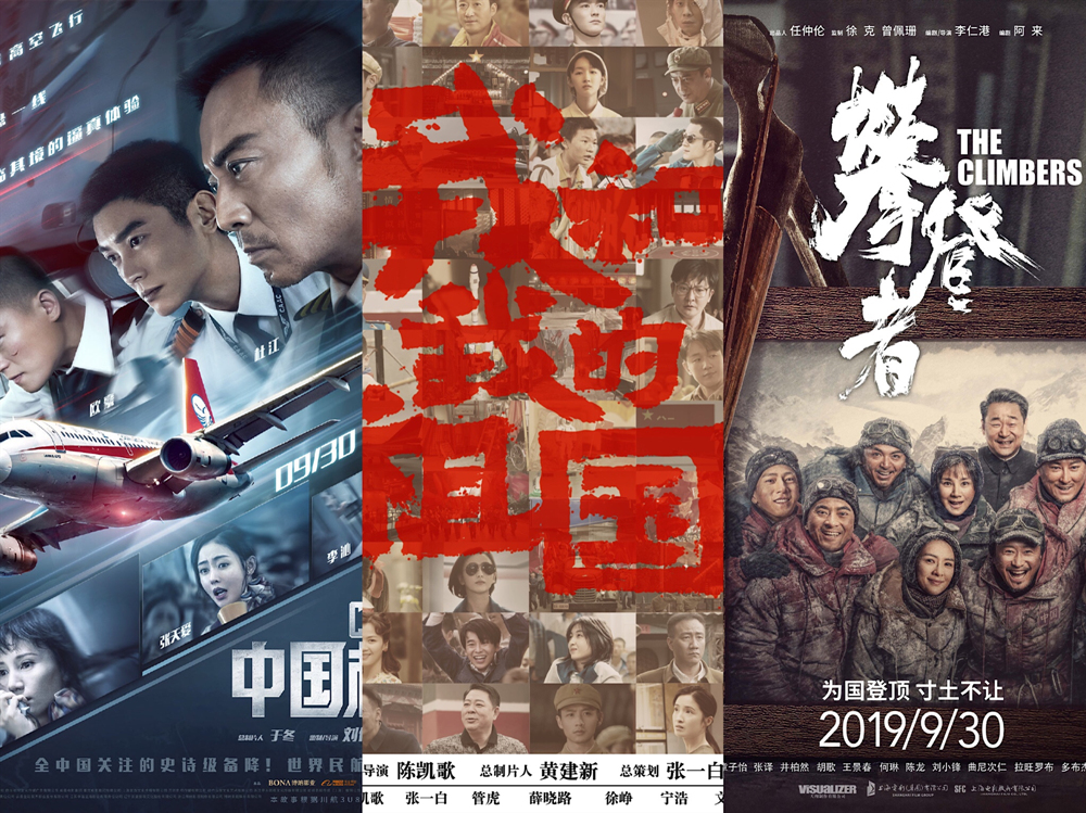 电影《中国机长》《我和我的祖国》《攀登者》海报。