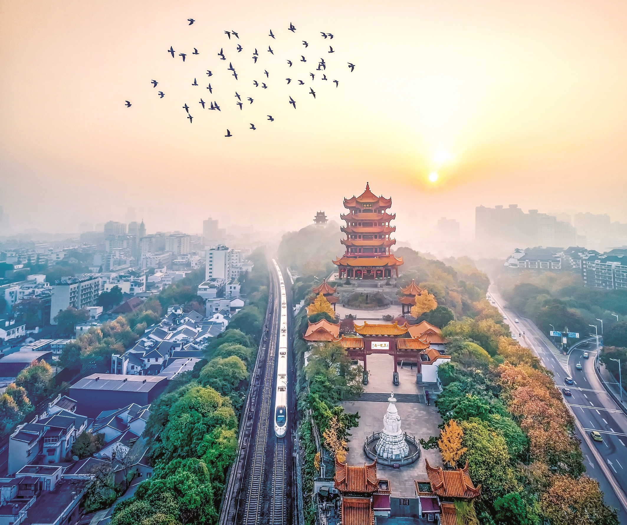 现场展出的湖北摄影家汪常青作品《黄鹤的故乡》正好反映了这一变化。汪常青对楚天都市报记者介绍,黄鹤楼周围每天都有鸽子盘旋,薄雾中颇有黄鹤归来之感。那天早上六点多,他用航拍无人机拍了半个小时,当最好的飞鸽图景出现时,火车正好来了,他迅速拍下这一画面。