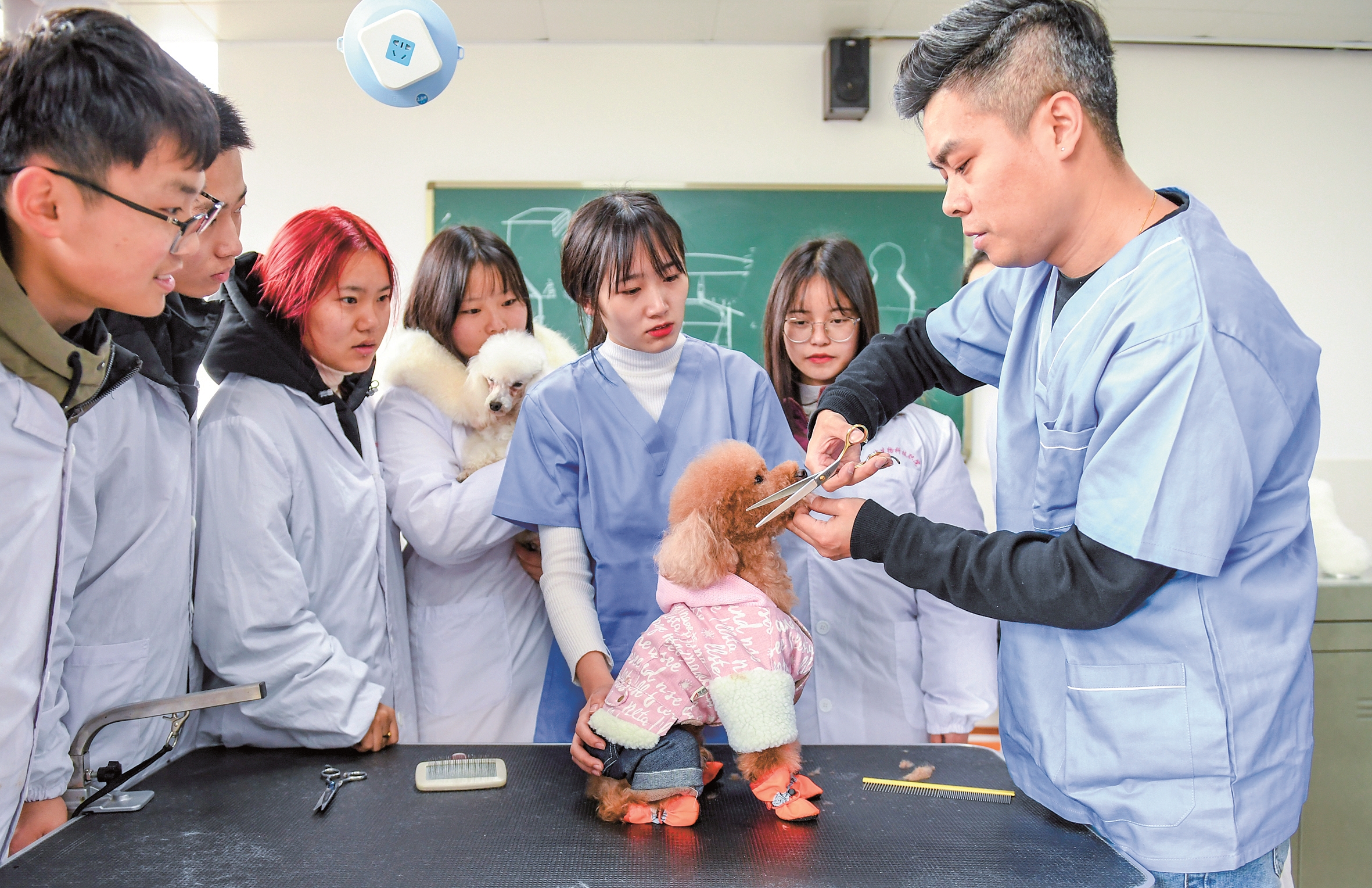 湖北生物科技职业学院,宠物养护与驯导专业学生学习动物美容