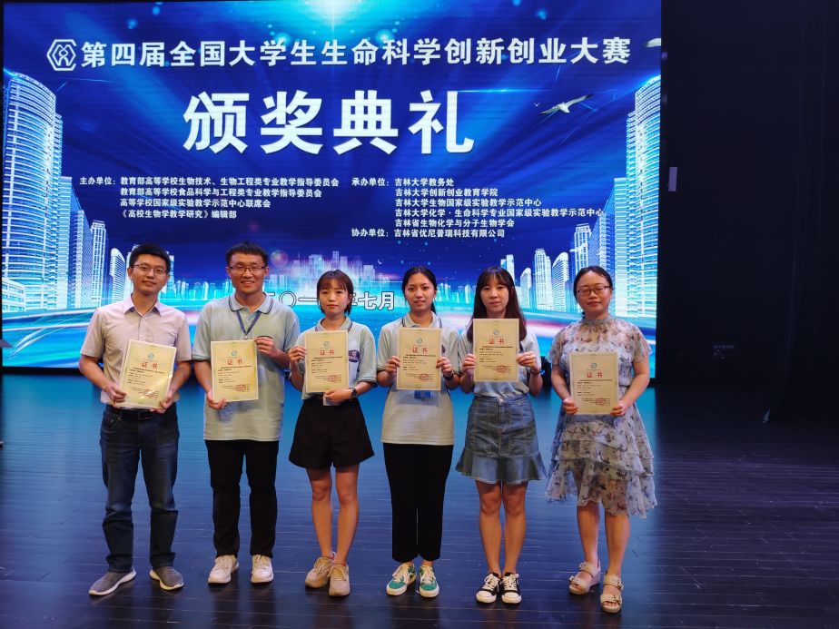 周瑜(左二)在第四届全国大学生生命科学创新创业大赛上领奖