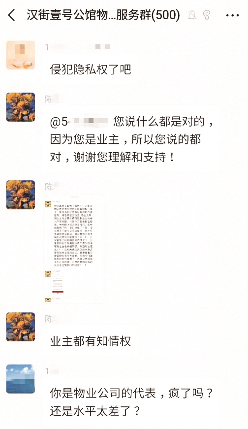 万先生认为物业侵犯了他的隐私权,是违法行为,于是报了警。万先生向记者提供了业主微信群的聊天记录,聊天记录与万先生的说法相符。记者看到,在陈姓负责人发布万先生信息遭万先生抗议后,该负责人解释称“业主都有知情权”。小区有几位业主在群里纷纷质疑物业此举侵犯了业主的隐私权。