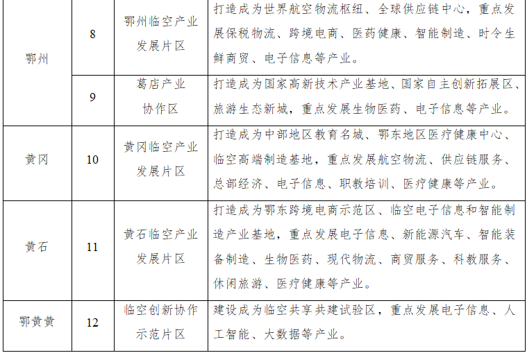 鄂州民用机场航空核心枢纽——重点发展综合保税物流、航空维修及服务保障、跨境电商、临空高科技制造、生物医药、大健康、时令生鲜集散商贸等产业。