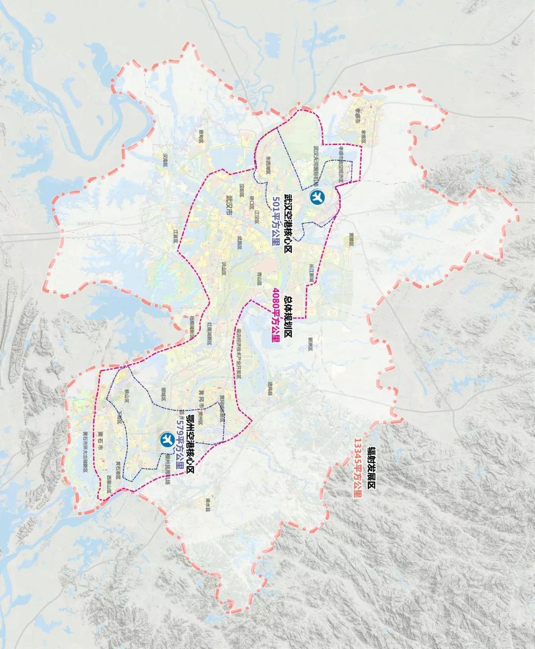 其中武汉空港核心区范围为北至武汉大临空规划边界,南至东西湖区界,西至武汉绕城高速,东至岱黄高速、滠水河。含武汉市黄陂区部分,东西湖区部分及孝感市临空经济区,面积约为501平方公里。