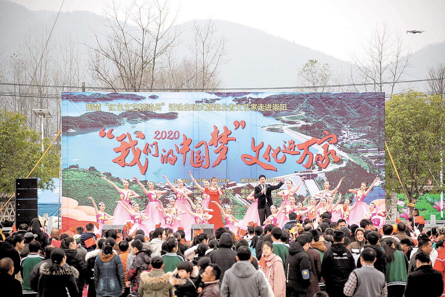 12月22日,2020年荆楚“红色文艺轻骑兵”活动在崇阳启动,文艺家们走进该县青山镇冷水港扶贫搬迁安置点,开展慰问演出活动,吸引当地千余名群众,现场热闹欢腾。自此,全省2495支“红色文艺轻骑兵”小分队,将深入基层广泛开展“我们的中国梦”──文化进万家活动。