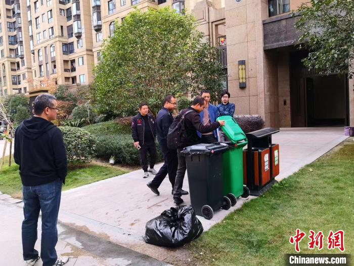 居民们翻看着自己小区楼下“新来的”一对分类垃圾桶 永嘉县委宣传部供图