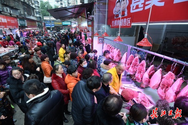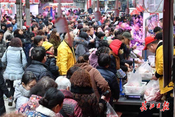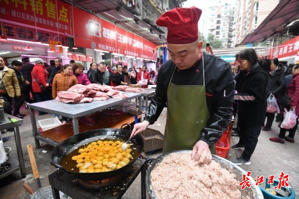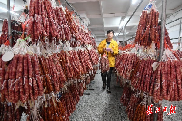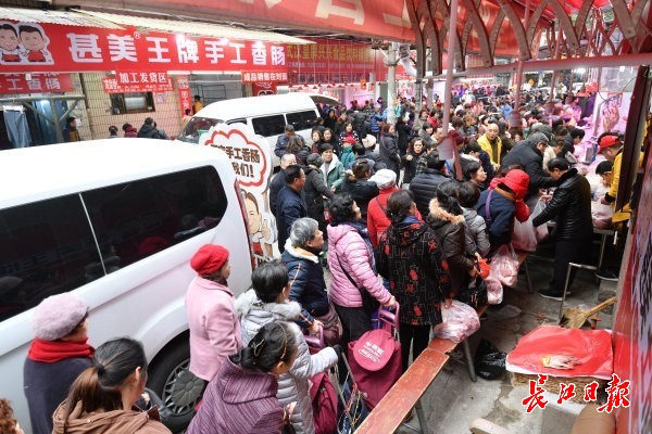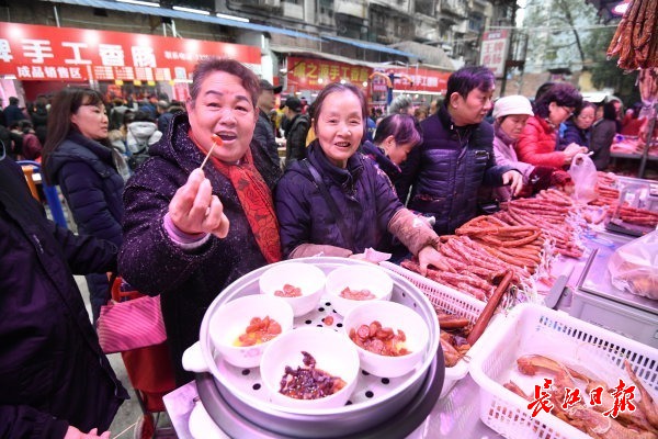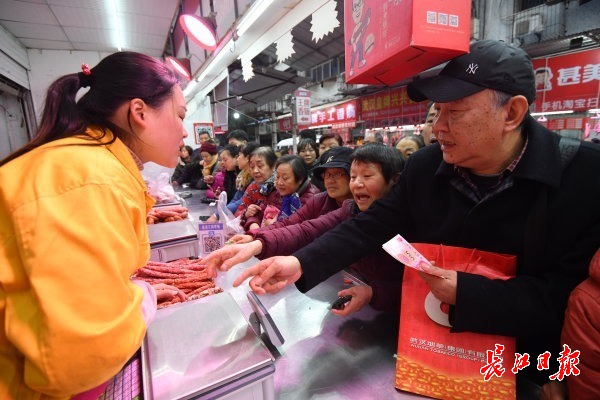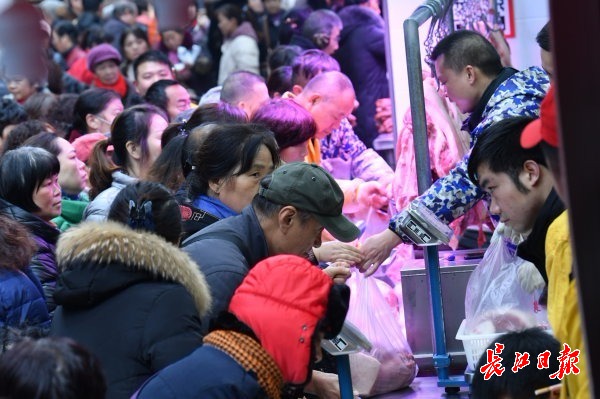 长江网12月23日讯 硚口区集贤里的“网红”香肠灌制点远近闻名,一大早,不少市民提着新鲜猪肉排队等待,广味、麻辣等不同口味的香肠是武汉市民必备年货。(记者詹松 摄影报道)