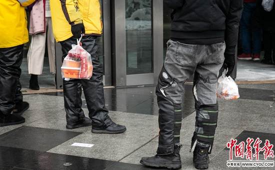 12月16日,北京通州区万达写字楼门口,两位外卖员在等待顾客取餐。见习记者 张玉佳/摄