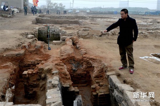 12月23日,在濉溪明清时期酿酒作坊遗址考古发掘现场,安徽省文物考古研究所副研究馆员陈超在介绍发掘出的双排蒸馏灶。新华社发(黄博涵摄)