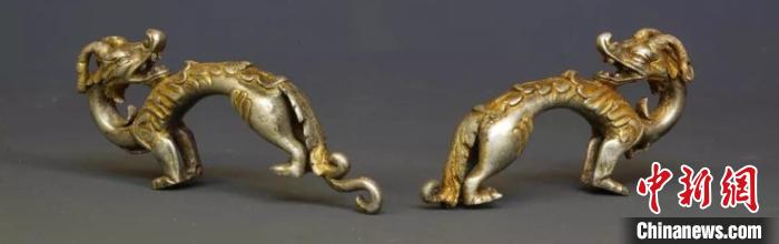 M189墓中出土的2件鎏金银龙,这种单体龙形式的器物在匈奴贵族墓葬中属首次发现。河南省文物考古研究院供图
