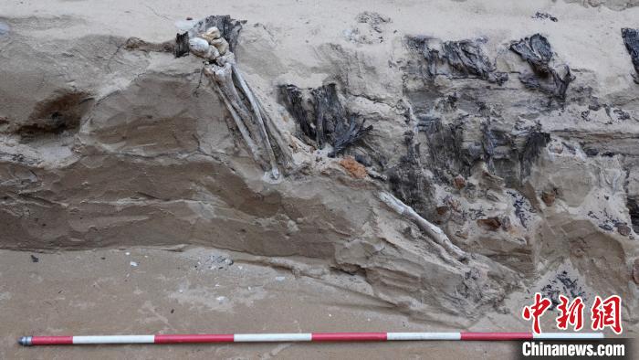 同时,在距离墓顶约11米深度发现木椁棚板。棚板上部东侧有一具俯身直肢青年男性人骨,头向南。蓝万里介绍,人骨样品的碳十四年代测定结果为东汉时期(22-170calAD),结合盗洞的位置正位于椁室东北角,推测此人应为盗墓者,从椁顶盗取椁室随葬品时因盗洞坍塌而被掩埋。