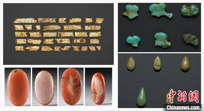 M189出土物品,左上为棺椁上的铁胎包金饰,左下为玛瑙丸,右上及右下为绿松石饰品。河南省文物考古研究院供图