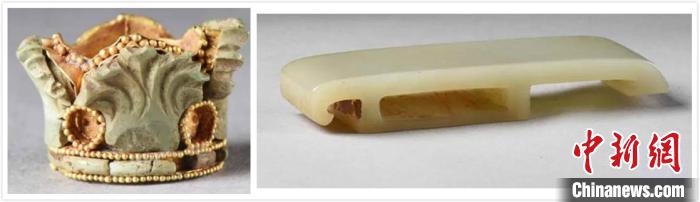 M10出土物品,左为金冠形饰品,小而别致;右为首次在匈奴墓葬中发现的玉剑璏。河南省文物考古研究院供图