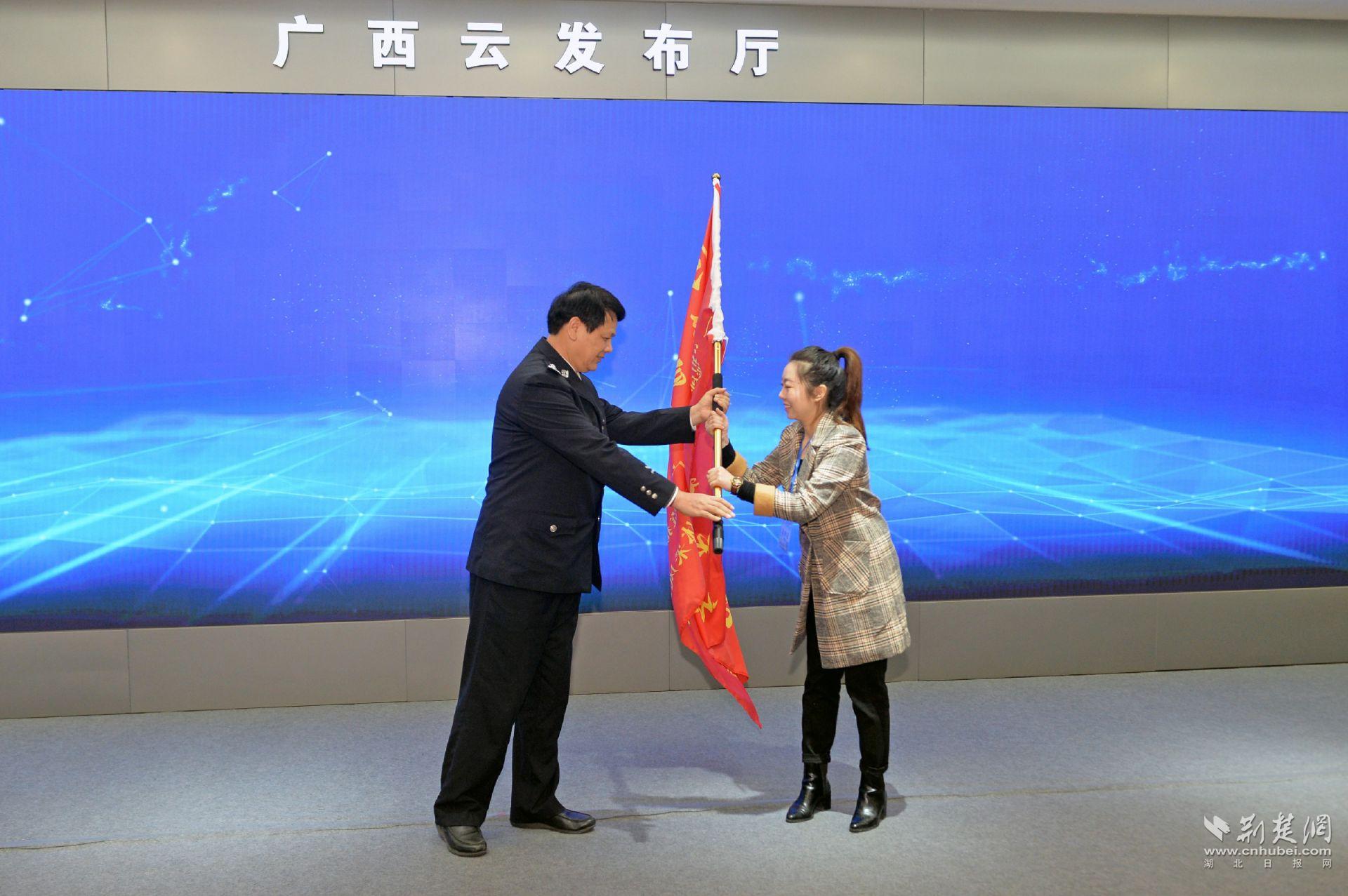 广西监狱管理局党委副书记、政委农中兴,为采访团授旗。广西新闻网全媒体报道组供图。
