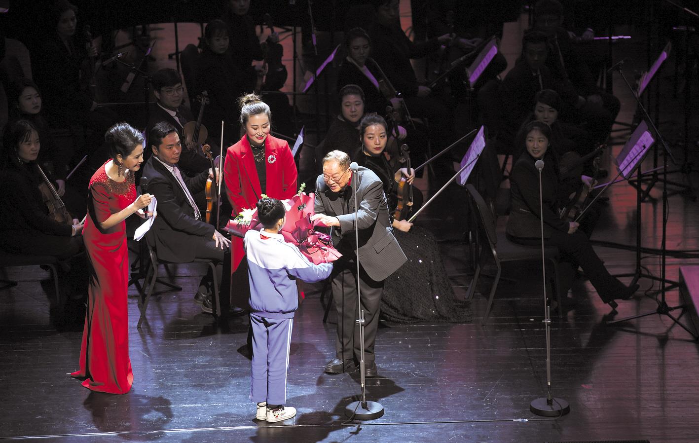 音乐会上,家乡少年为杜鸣心捧上鲜花。(视界网 吴燕军 摄)