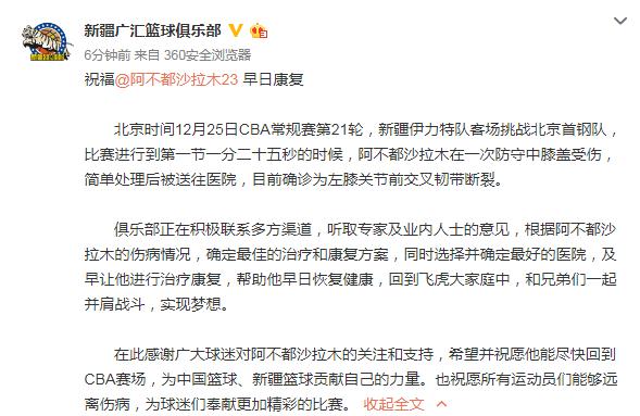 中新网12月26日电 26日下午,新疆广汇篮球俱乐部发布公告,在昨晚客战北京首钢比赛中受伤离场的阿不都沙拉木,目前确诊为左膝关节前交叉韧带断裂。俱乐部表示将确定最佳的治疗和康复方案,同时选择并确定最好的医院,及早让他进行治疗康复。