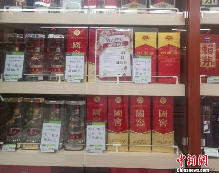 如,在北京丰台区一家永辉超市,泸州老窖推出“岁末狂欢 感恩有礼”活动,目前500ml的52度国窖1573售价是1099元一瓶,与此前宣布的建议零售价保持一致,但购买立减100元;剑南春52度白酒售价459元,买一瓶立减40元。