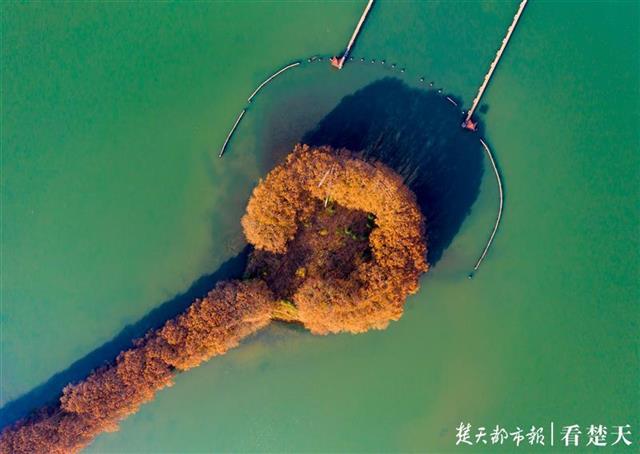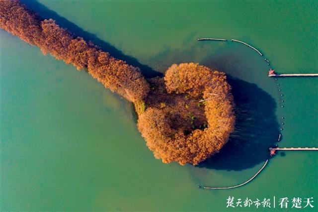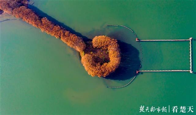 12月27日,江城天气晴好,东湖绿道团山驿站旁,一条深入湖心的栈道在无人机镜头下宛如金黄色的“吊坠”镶嵌进湖心,美轮美奂,给冬日的东湖增添别样景致。