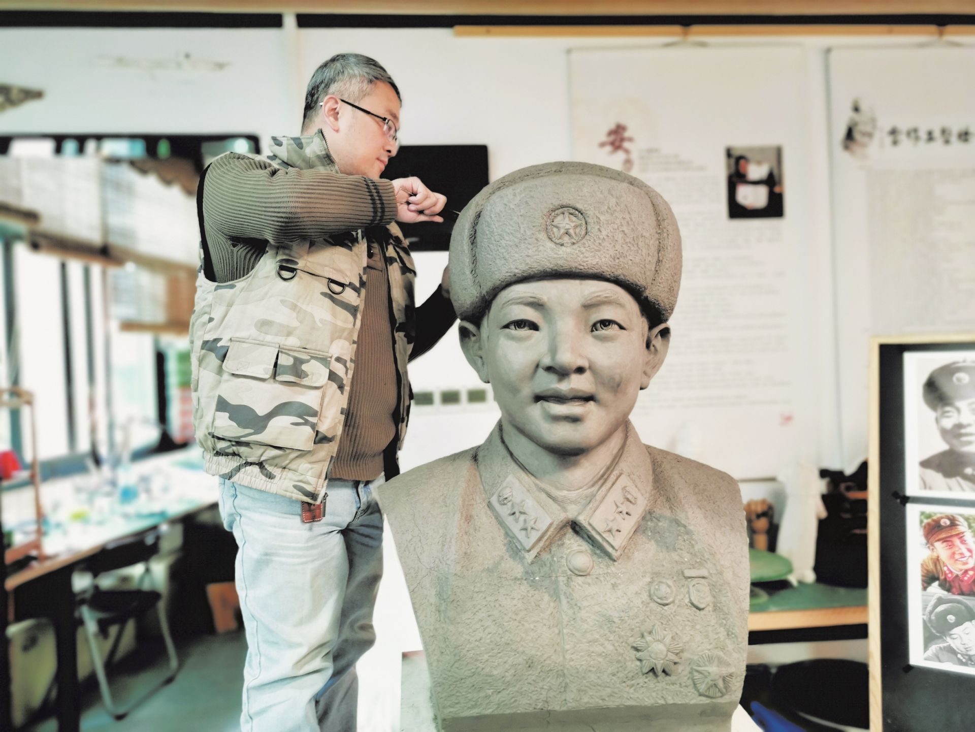 12月18日,记者走进安志柏、安力工作室,高达1米的雷锋半身像已初具模型:头戴棉帽,身穿军装,笑容温暖——这不正是儿时记忆中的雷锋吗?安力告诉记者,“每天到工作室的第一件事,就是在雕像前观察几分钟,从各个方向捕捉细微的差别。石雕非常考验功底,每次落刀、起锤,位置要心中有数,力道要均匀一致,否则就会功亏一篑。”
