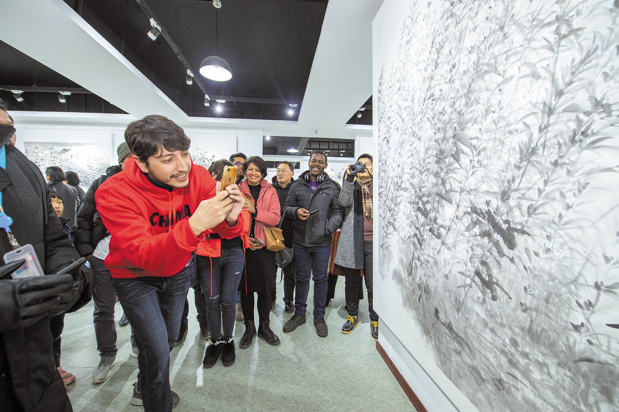12月26日,外国留学生在湖北省国画院欣赏国画。当日,中国国画艺术交流社会实践活动在湖北省国画院举行,来自华中师范大学的20余名留学生走进省国画院,观摩国画,并与画家座谈交流,感受中国传统文化的魅力。