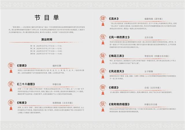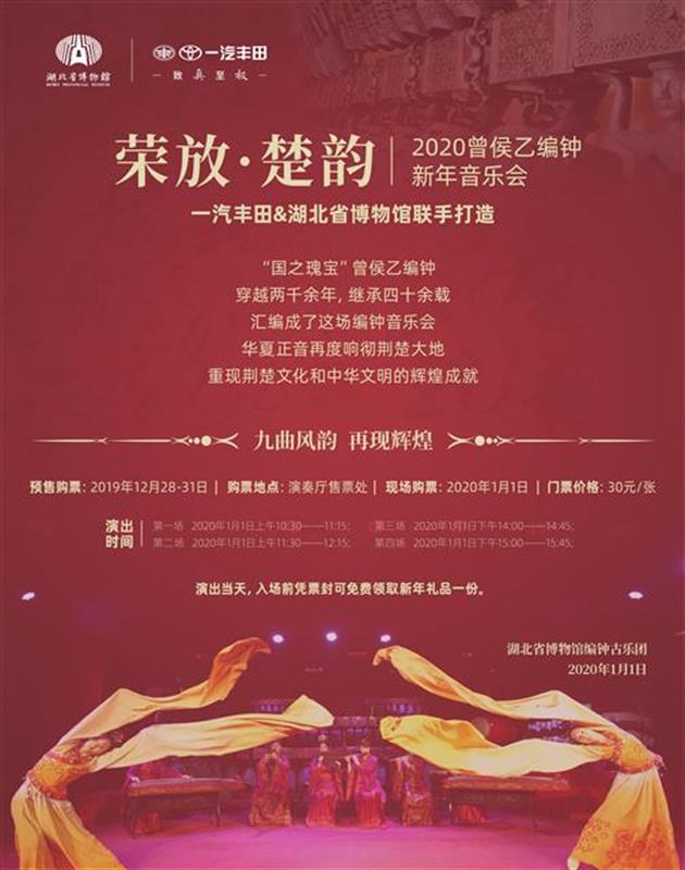 湖北省博物馆编钟古乐团负责人马业平称,本次音乐会亮点很多,是集歌、乐、舞为一体的一场视听盛宴;有编钟古乐团史上最完整、最强的演出阵容;并为观众准备了精美的新年礼物。观众可在演奏厅售票处现场购票,也可于12月28日至31日预约购票。