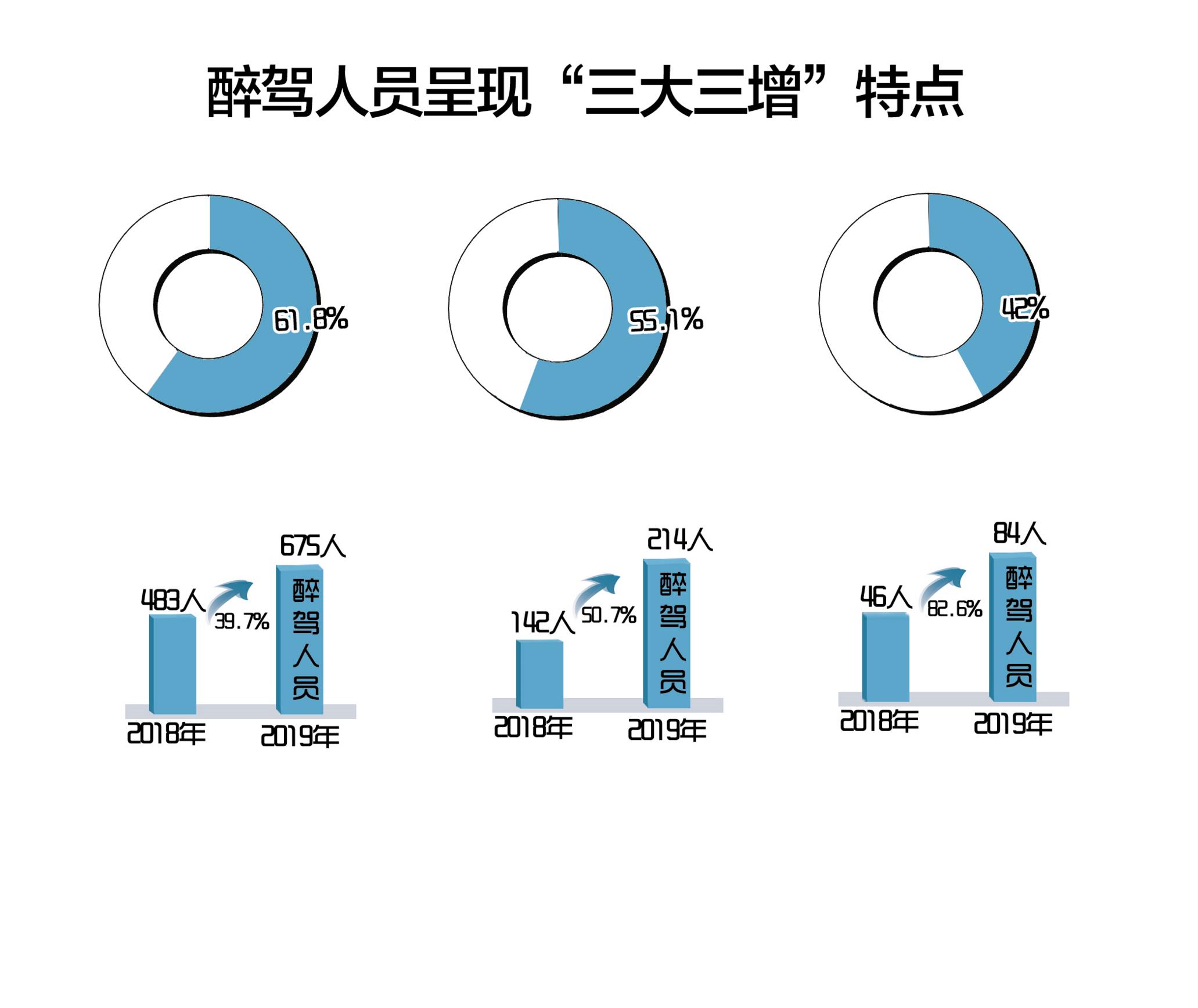 ●30岁以下醉驾人员增多。今年共查获20岁至30岁醉驾人员675人,比2018年增加192人,增幅39.7%。