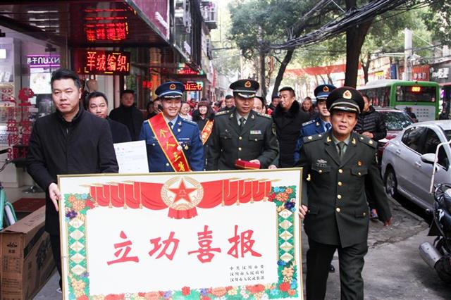 军地工作人员抬着硕大醒目的“立功喜报”牌匾,立功受奖人员身披绶带、胸戴红花、佩戴军功章,在众人拥簇下自豪地穿行在闹市人群中,吸引了很多群众。敲锣打鼓送喜报的热烈形式、拥军优属暖人心的浓厚氛围,感染了现场所有人。