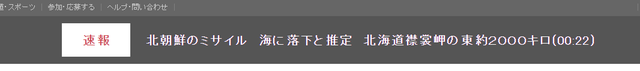据此前报道,NHK当地时间27日凌晨零时22分在网站发放消息,称朝鲜发射了一枚导弹,并坠落在北海道襟裳岬以东约2000公里的海面,但NHK在23分钟之后澄清是误报。