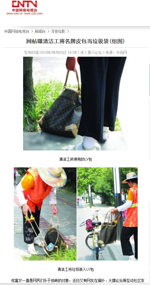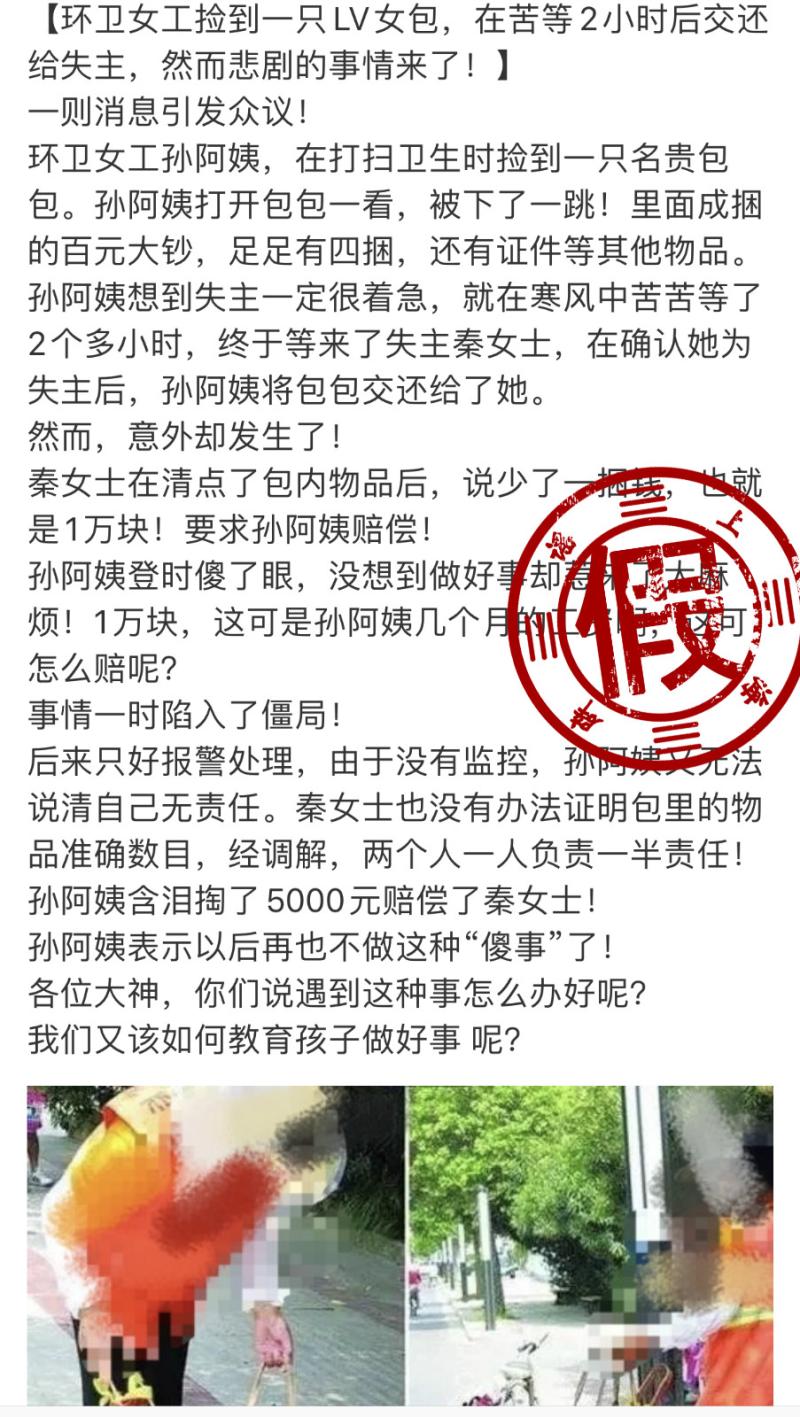 这两天,一条题为《环卫女工捡到一只LV女包,在苦等2小时后交还给失主,然而悲剧的事情来了!》的帖子在网上热传。帖子讲述了一个故事:环卫女工孙阿姨捡到一只LV女包,内有四捆百元大钞和证件等物品,孙阿姨在寒风中苦等2个多小时终于等来了失主。不料失主却称,百元大钞本应为5捆,包里现在少了一捆整整一万元。报警调解后,双方各负一半责任,孙阿姨含泪赔了5000元给失主。而这5000元,正是孙阿姨几个月的工资。帖子中还附有一张环卫工人拎着女包的照片。