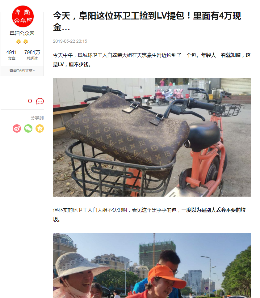 据安徽阜阳媒体报道,今年5月的一天中午,安徽阜城环卫工人白翠荣大姐捡到了一个LV包,和同事一起打开包后,白大姐吓坏了,里面竟然放着整整4摞崭新的百元大钞。失主姚先生在接到环卫公司的电话后赶来,他表示这只包价值一万多元,包里不仅装有4万元现金,还有一份比现金重要得多的合同。白大姐的朴实善良,让失主姚先生很感动。姚先生掏出现金硬塞给白大姐,白大姐说什么都不肯收。对于白大姐拾金不昧的行为,环卫公司表示将给予经济上的表彰和精神上的鼓励。