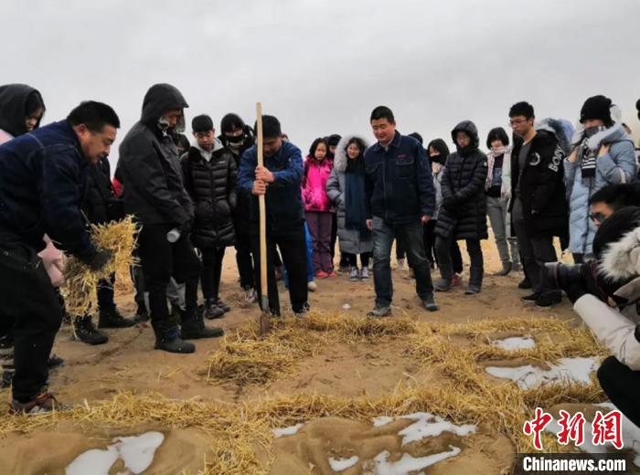 图为深圳师生体验莫高窟治沙工程,亲手种下了一方草方格。 杜玉磊 摄