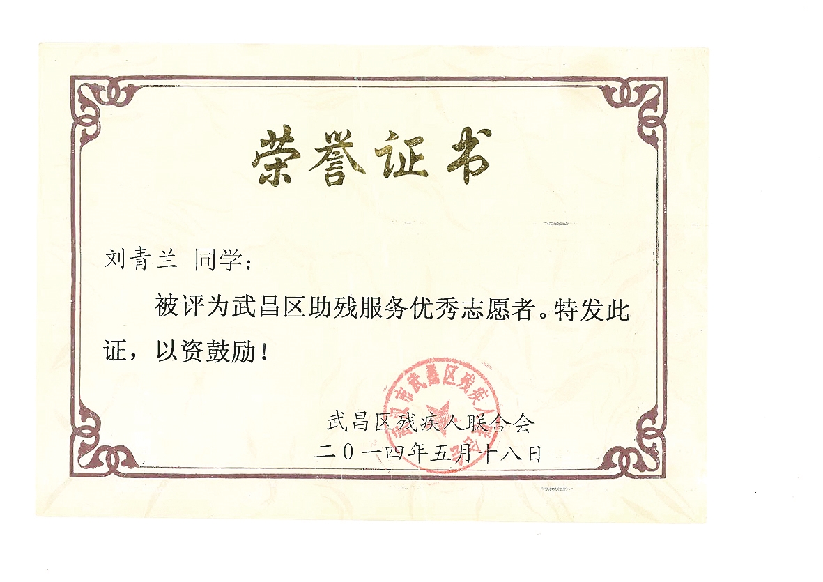 大三那年,她坚持每周去武昌司门口的阳光家园做志愿者,“给他们进行心理疏导,教他们与人交际的本领。他们把我当老师,我的心里像蜜一样甜。”刘青兰说,那一年她还申请加入了清华大学胡传鹏博士的研究小组,与胡博士合作修订心理量表。那段日子,是她最快乐的时光。