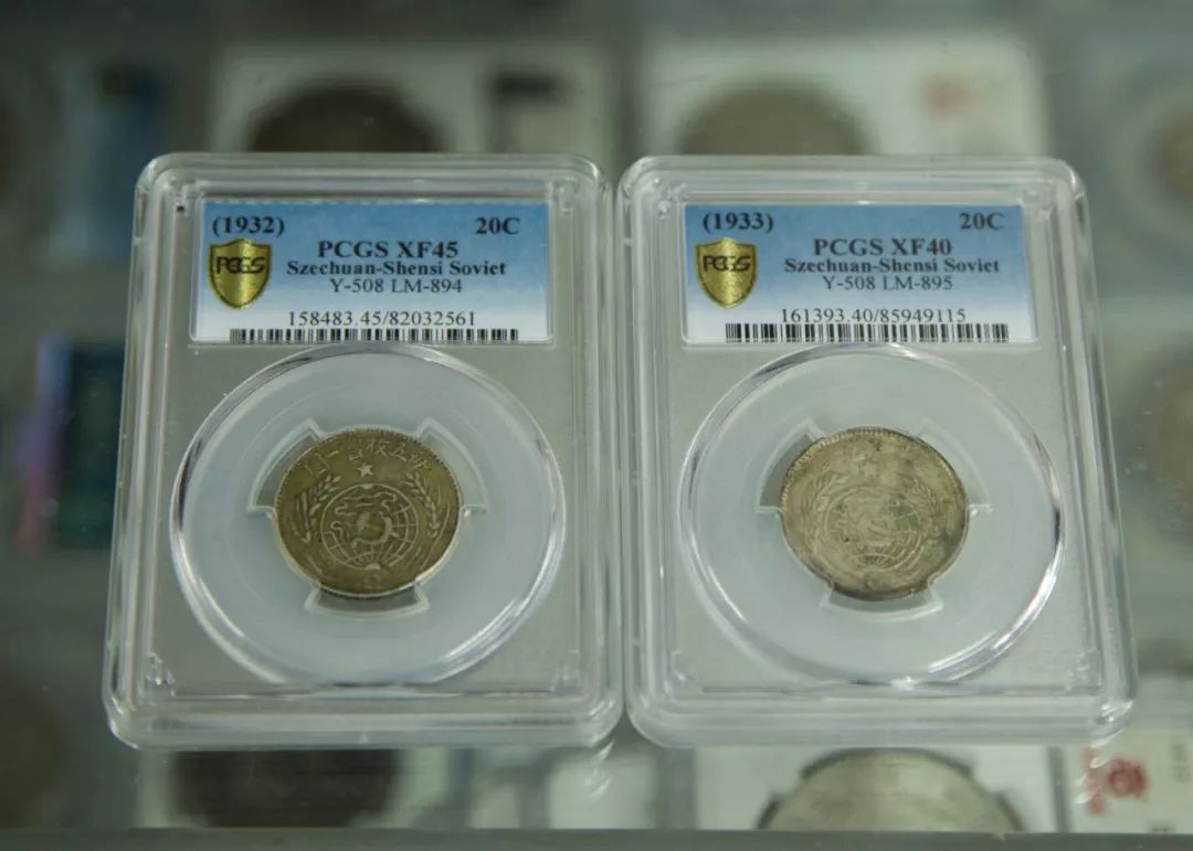 而说到最有故事的钱币,罗先生笑着打开了柜台内侧、电脑桌下的保险柜,“这个是在红色革命根据地瑞金淘来的。这两枚是中华苏维埃共和国时期的钱币,一个1932年,一个1933年,1934年就到陕西了。这两个不舍得卖,要摆在保险柜里面。”