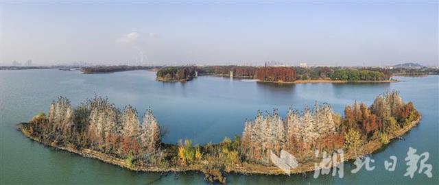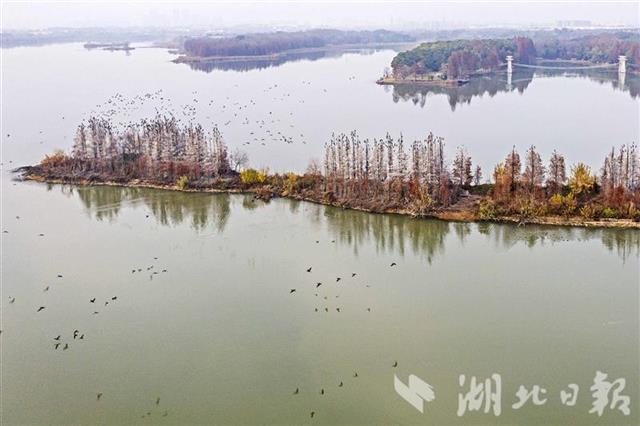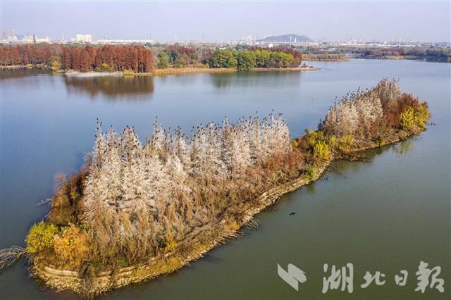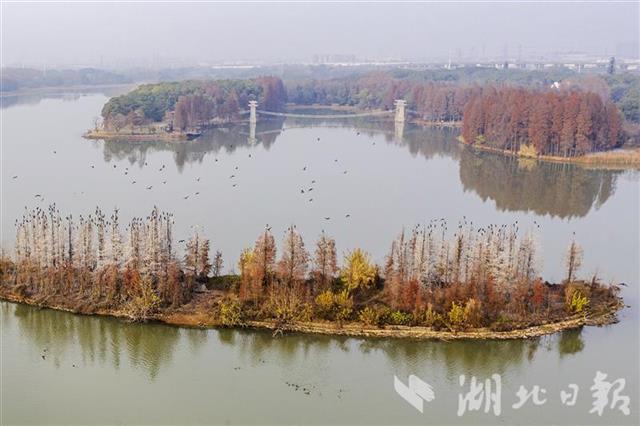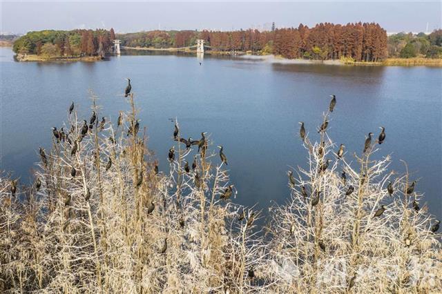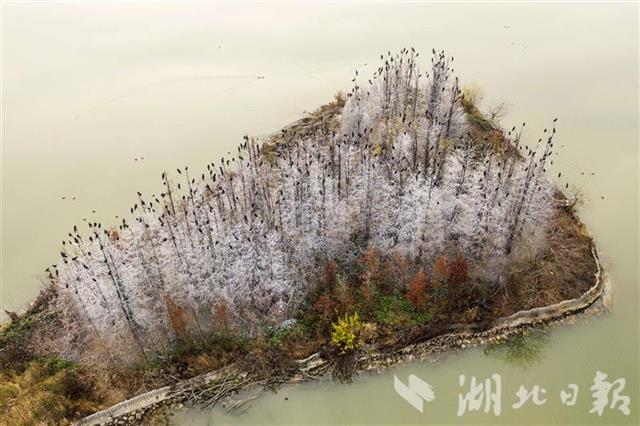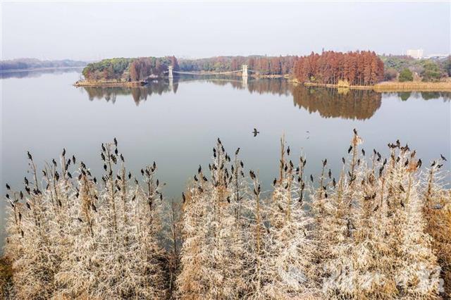 12月29日,在武汉东湖落雁景区,只见鸟岛上长满池杉,树梢树枝上站满了鸬鹚。偶尔,有鸬鹚飞离树梢,在水上盘旋掠食。鸬鹚是冬候鸟,每年11月迁徙到此越冬,来年2、3月份离去。鸟岛位于湖中,四面环水,无人惊扰,这里成了鸬鹚等候鸟越冬的天堂。(湖北日报全媒记者 梅涛 摄)