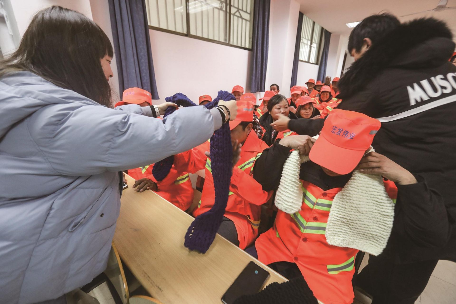 前日,这群大学生志愿者将148条围脖,给148位环卫工人戴上。环卫工刘敏戴着围脖说:“真是好看又暖心。”