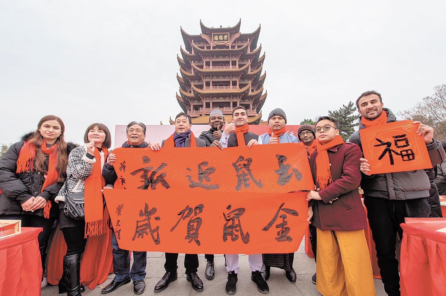 2019年12月31日,我省书法家同外国留学生在黄鹤楼前合影,共同展示书法作品。此次活动以“编织未来城市梦,奇思妙想书新年”为主题,4名书法大师挥毫泼墨,带领由中小学生、外国留学生、市民游客组成的百人书法方阵,共书新年期许和梦想。