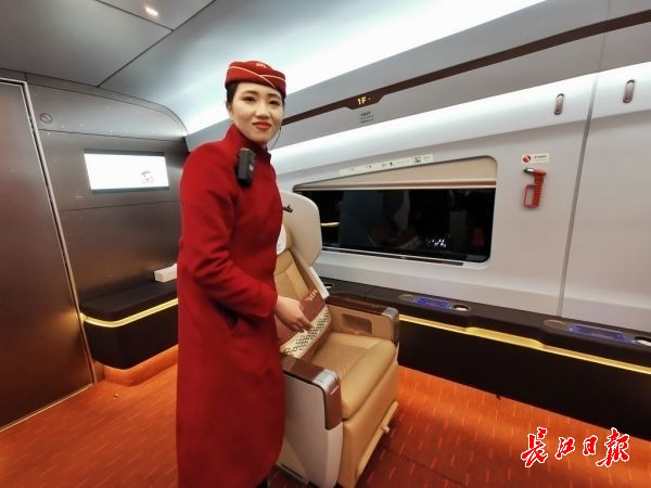 黄颖还向长江网记者演示了车厢里的众多“黑科技”,比如车厢内的灯光都是智能控制的,充满了科技感;在商务舱内,座椅旁边新增了手机无线充电装置,未来智能列车还将安装移动的新闻中心,旅客坐在列车上就能随时看奥运直播。